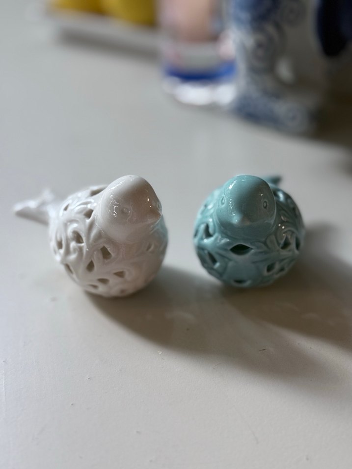 Turkuaz ve beyaz renklerde, ince oyma desenlere sahip seramik kuş bibloları. Dekoratif amaçlı kullanıma uygun. ️