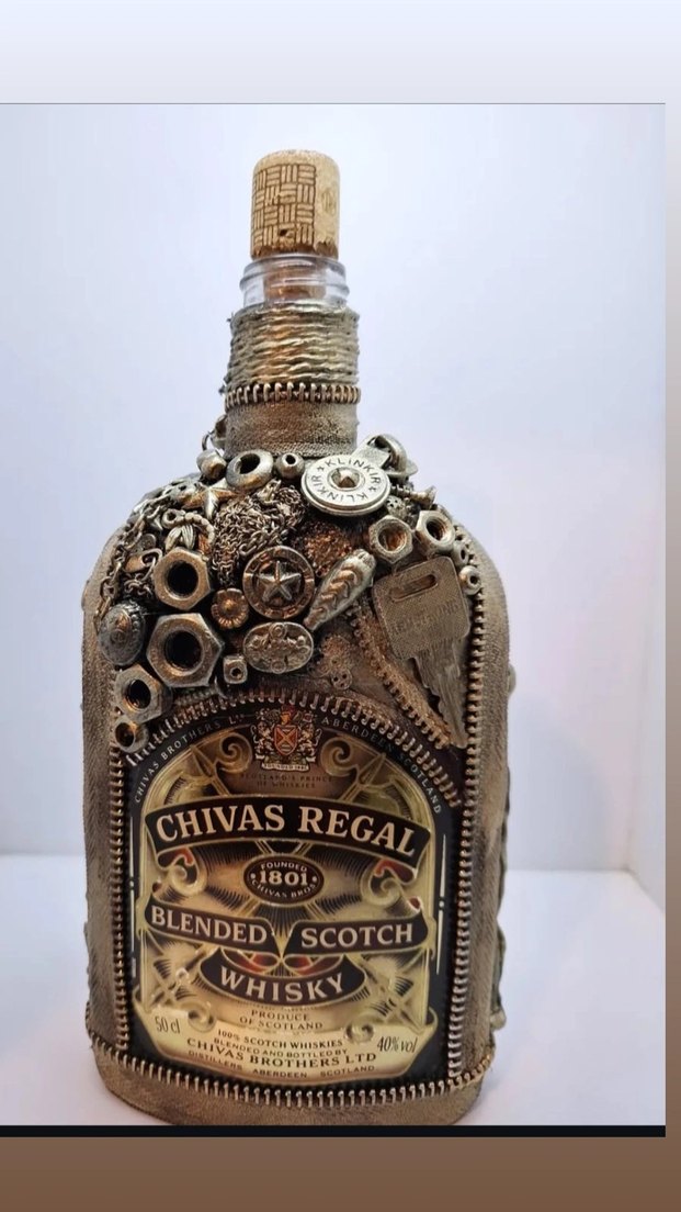 Bohem tarzı vintage kahverengi şişede gri detaylı biblo Şişe metal süslemeler ve mantar tıpa içerir. Üzerinde 'Chivas Regal Blended