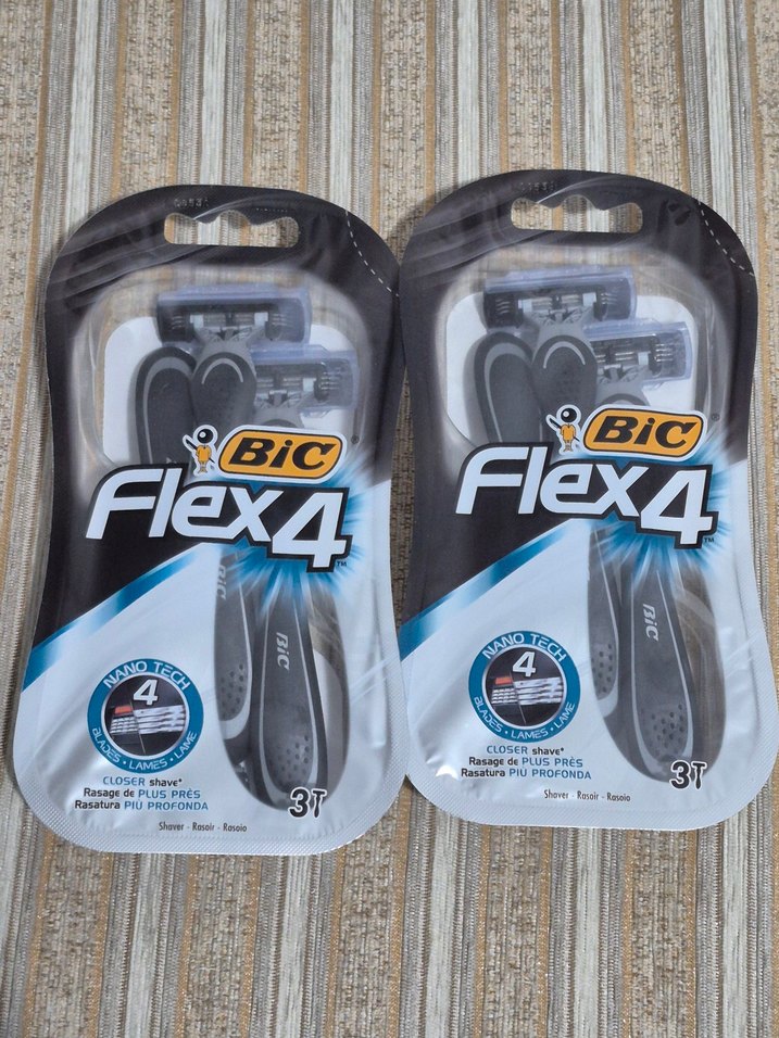 Bic Flex4 gri erkek tıraş makineleri, dört bıçaklı, yakın tıraş için. Üçlü paket halinde, pürüzsüz ve hassas tıraş sağlar. 2x3 toplam 6 başlık