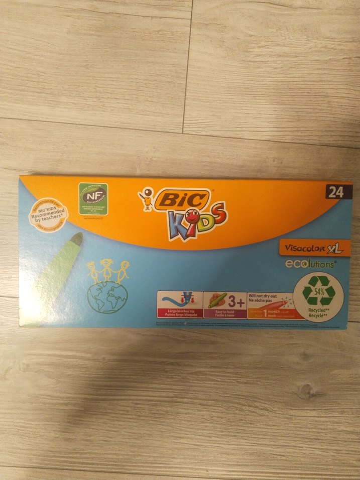 3 yaş ve üzeri çocuklar için 24 renkli BIC Kids kalem seti. %54 geri dönüştürülmüş malzemeden yapılmış, çevre dostu ve canlı renklere sahip. ✏️