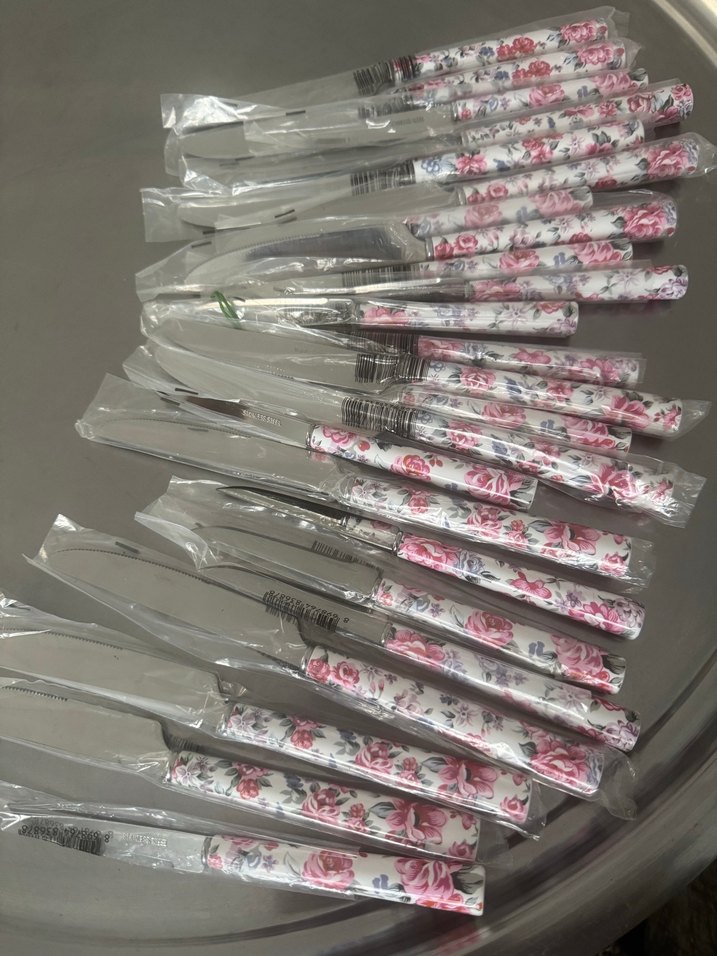Pastel pembe renkli, çiçek desenli saplara sahip bıçak seti. Her bıçak hijyen için ayrı ayrı paketlenmiştir.
