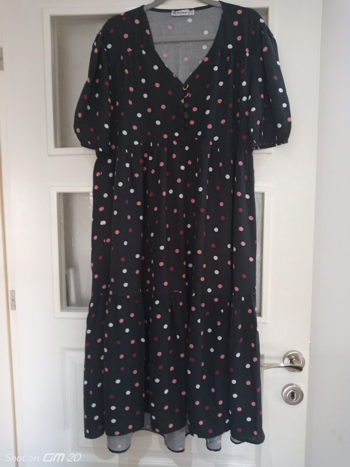 Düğmeli, V yakalı, kısa kollu, bol kesim uzun elbise. Siyah zemin üzerine renkli puantiyelerle bohem tarzda, hafif sentetik kumaştan.