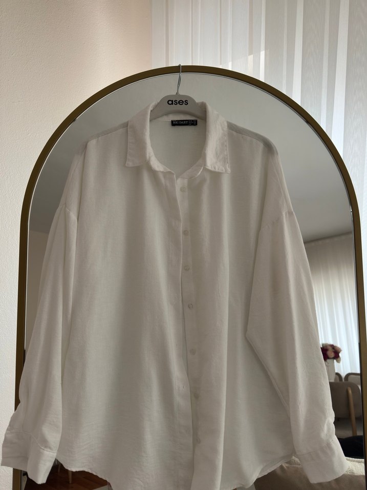 Hiç giyilmedi 40 beden tamamen pamuklu Düğmeli, yakalı, uzun kollu, beyaz keten kadın gömlek. Salaş kesimi ve parlak dokusuyla günlük şıklık sunar.