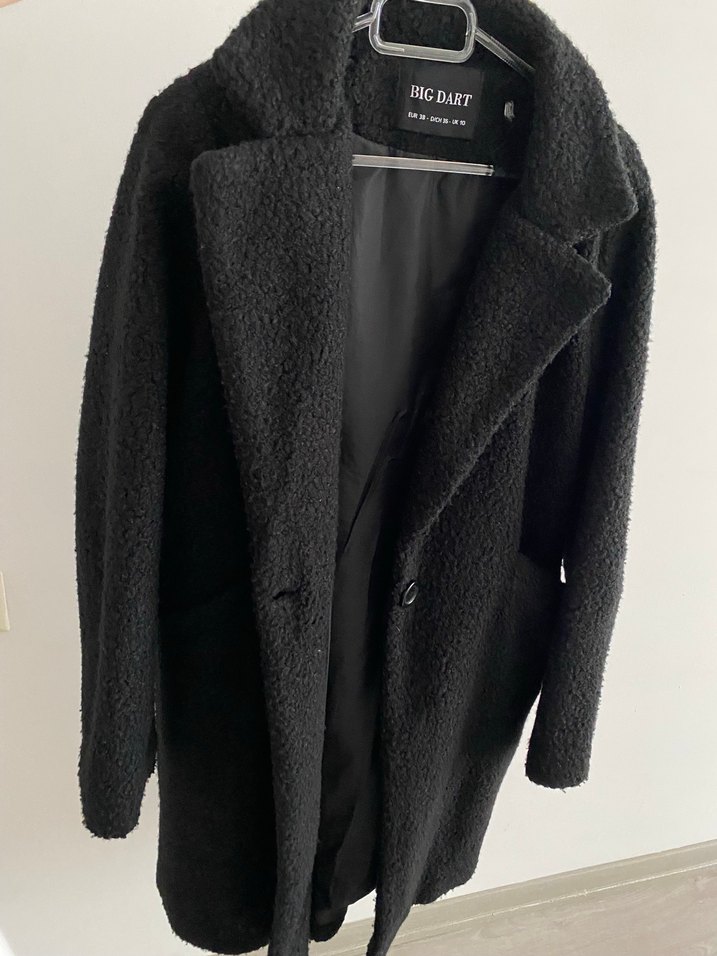 Siyah BIGDART kaban, yumuşak kabarık kumaş ve klasik yaka ile uzun kolludur. 36 bedenede uygundur