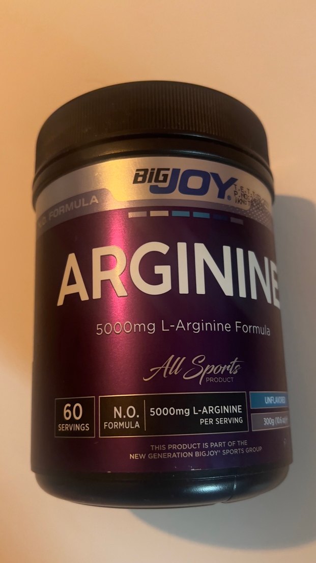 BigJoy Arginine tozu, porsiyon başına 5000mg L-Arginin içerir ve toplam 60 porsiyondur. Tatlandırılmamıştır, spor amaçlıdır. ️ 200 gr kadar
