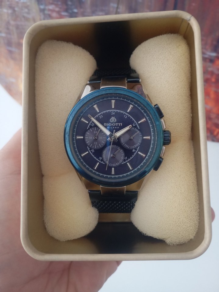 Bigotti markalı erkek saati, lacivert kadran ve çoklu alt kadranlara sahip. Koyu metal kasa ve uyumlu koyu örgü kayış ile modern klasik tarz sunar. ⌚