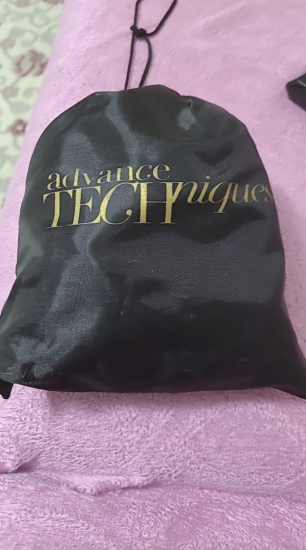 Parlak siyah renkte, önünde 'advance TECHniques' yazılı çantasında 7 adet bigudi