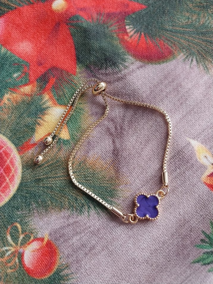 Kadın bileklik, zincir detaylı renkli mor yonca figürlü, ayarlanaibilir kilidiyle günlük kullanım için uygun, tie-dye desen havası taşıyor.