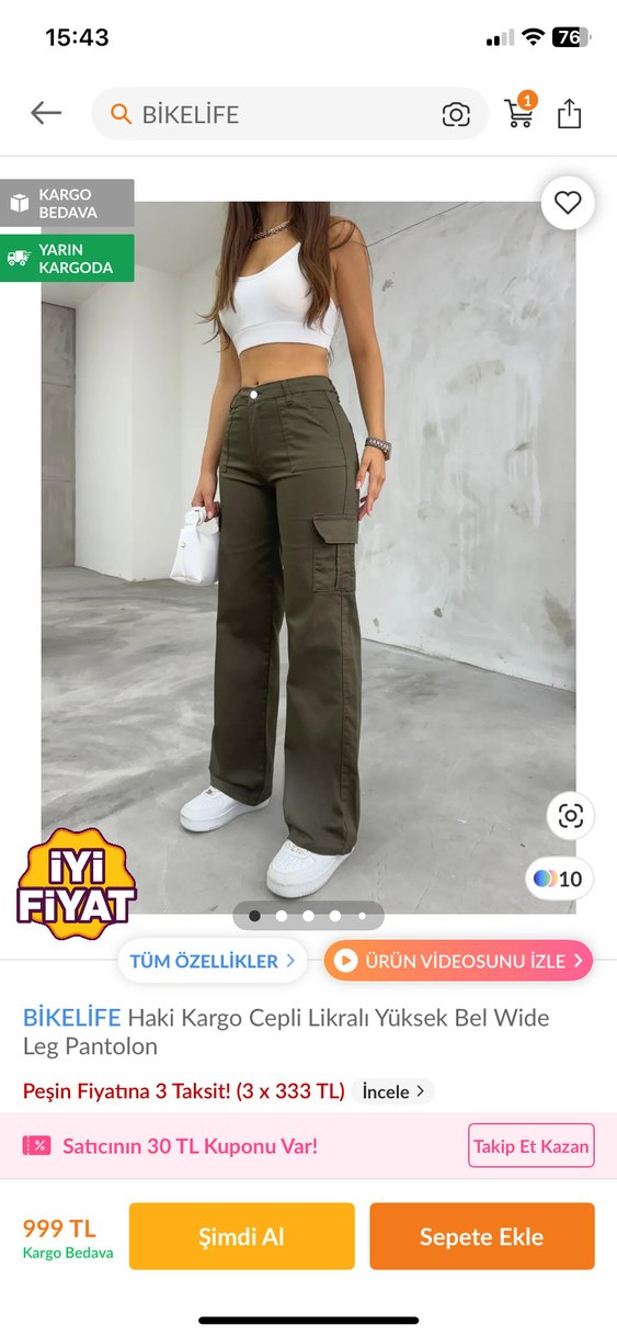 Yüksek bel, likralı hafif kahverengi geniş paça kargo pantolon.Hiç kullanılmadı etiketi üzerinde bedeni olmadı iade süresi geçtiği için de iade edemedim.Trendyolda satış fiyatı 1000 tl.