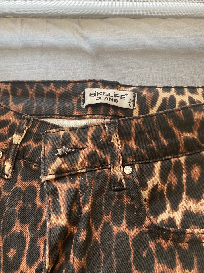 BiKELiFE kemerli, baskılı, kahverengi biker pantolon. Sentetik kumaştan, oturan kesim ve midi boyda, grunge punk tarzında. ️ HİÇ GİYMEDİMMMM