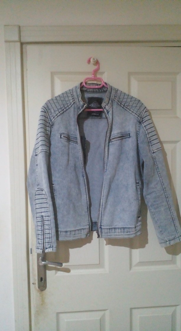 Soluk mavi renginde, biker tarzı Unisex denim ceket. Normal kesim ve fermuarlı ön kapama, uzun kollu, yakası kesik detaylı, omuz ve kollarda kapitone desenli. Günlük kullanıma uygun.