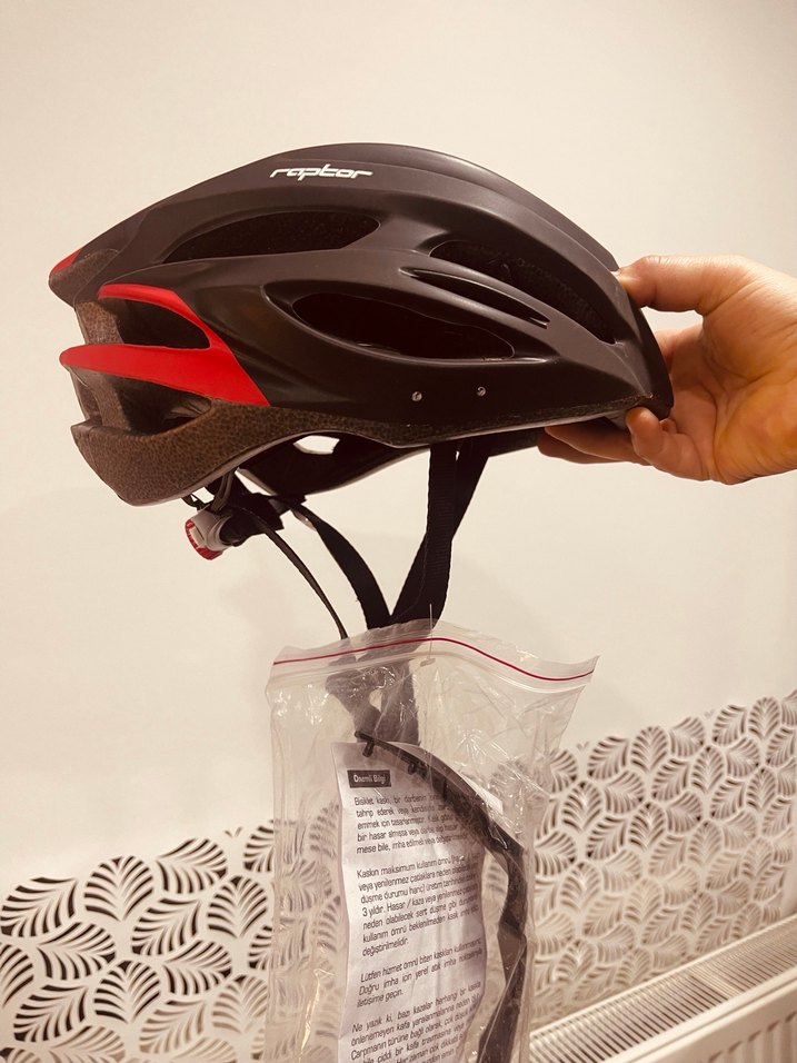 Kırmızı desenli, plastik malzemeden yapılmış biker tarzı bisiklet kaskı. Velcro kayışlı, trend ve avangard tasarıma sahip. ️SIFIR üründür hayırlı olsun