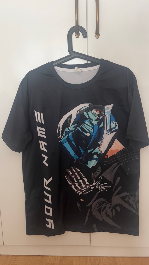 Siyah renkli, baskılı biker desenli, sentetik kumaştan üretilmiş, bisiklet yaka ve kısa kollu