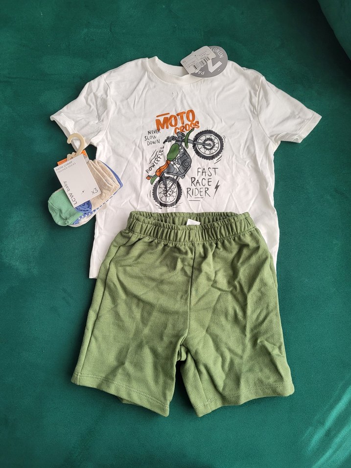 Beyaz biker baskılı kısa kollu pamuklu tişört ve yeşil pamuklu şorttan oluşan bebek erkek takımı. Tişört, bisiklet yaka ve baskılı yazılar içerir. ️çorap da var