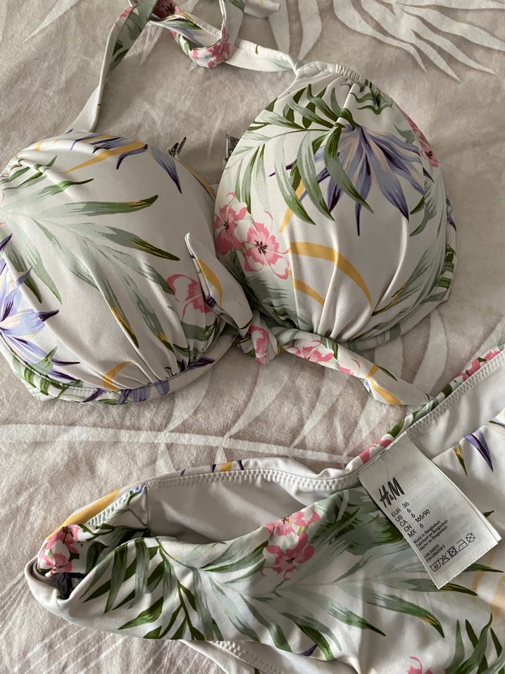 Bir defa giyildi çok şık Bohem tarzda, pastel çiçek desenli, pileli ve askılı bikini üstü. Plaj için uygun, rahat kesim ve normal boyda.
