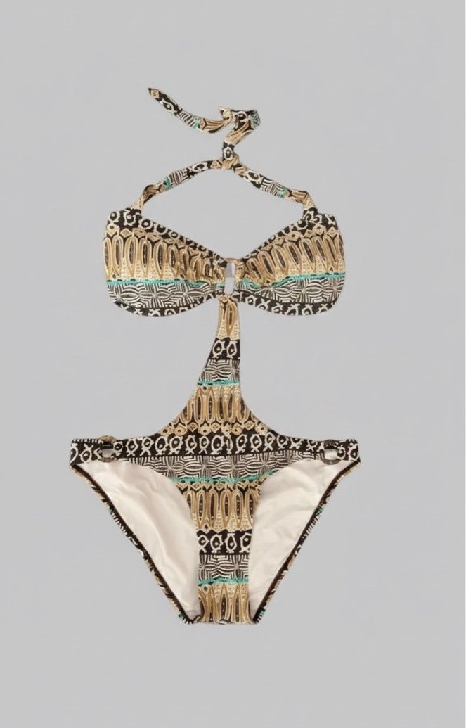 Bu bohem yılan desenli bikini, ince askılar ve boncuk detayları ile tasarlanmıştır. Açık kahverengi tonları ve mini boyu plaj için uygundur. S M L UYUMLU