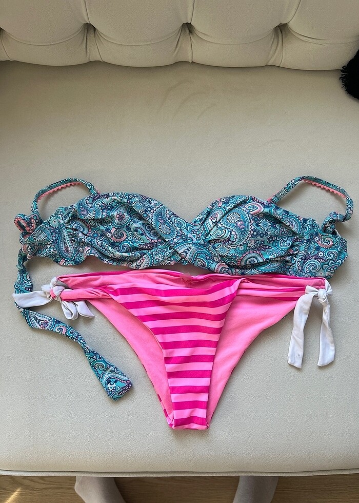 Mavi ve pembe bikini takımı üstü 38 beden alt large beden üçgen siz istediğiniz şekilde kombinleyebilirsiniz.