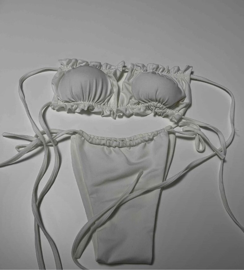 Beyaz bikini takımı, fırfırlı kenarları ve ayarlanabilir ip detayları ile günlük kullanıma uygun, bohem tarzda dar kesim sunar.