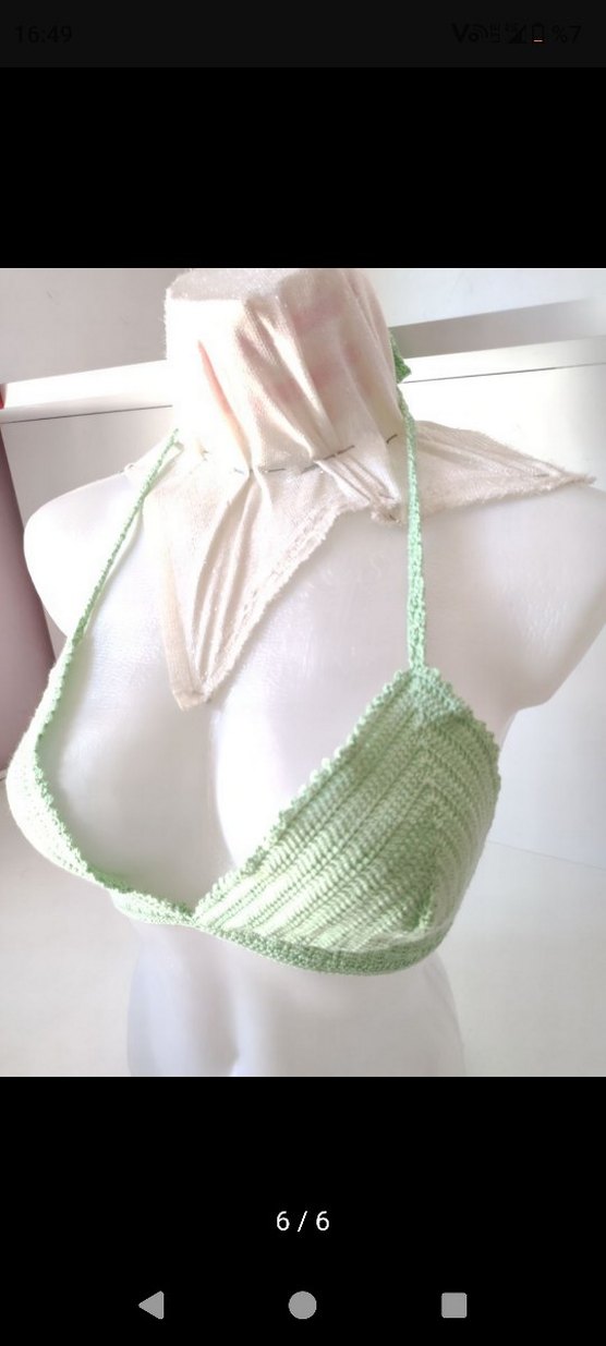 Pastel yeşil renkte, yumuşak örgü dokulu bohem tarzda, normal uzunlukta rahat bir büstiyerdir.