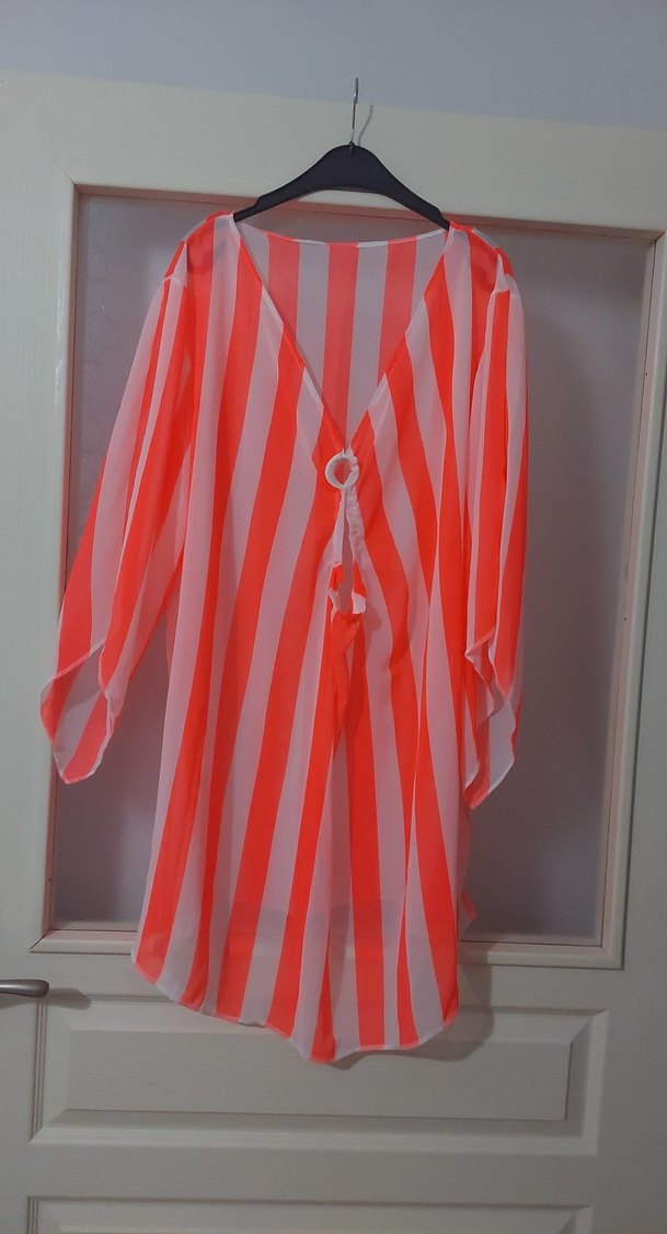 Çizgili Nar Çiçeği Renginde Plaj Bikini Üstü L XL uyumlu.