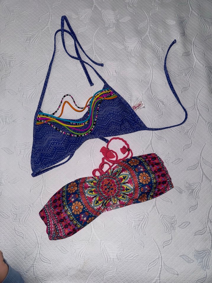 Renkli nakışlar ve boncuk detaylarıyla bohem tarzda, kısa kesim ve ince askılı, plaj için uygun bikini. Canlı ve uyumlu desenlere sahiptir.