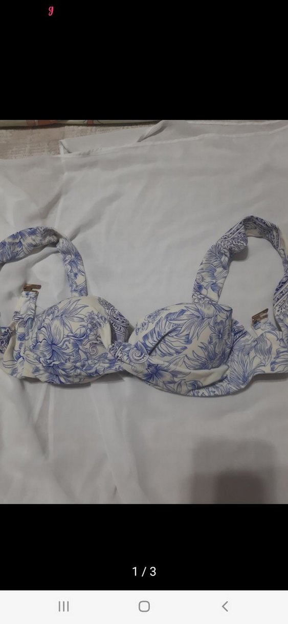 Mavi bağlamalı, çiçek desenli, askılı ve tokalı bikini üstü