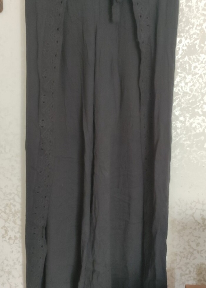 Hiç kullanılmadı etiketi yok ama tertemiz önden yırtmaçlı yirtmac yerlerinde işlemeler var belden bağlamalı pantolon