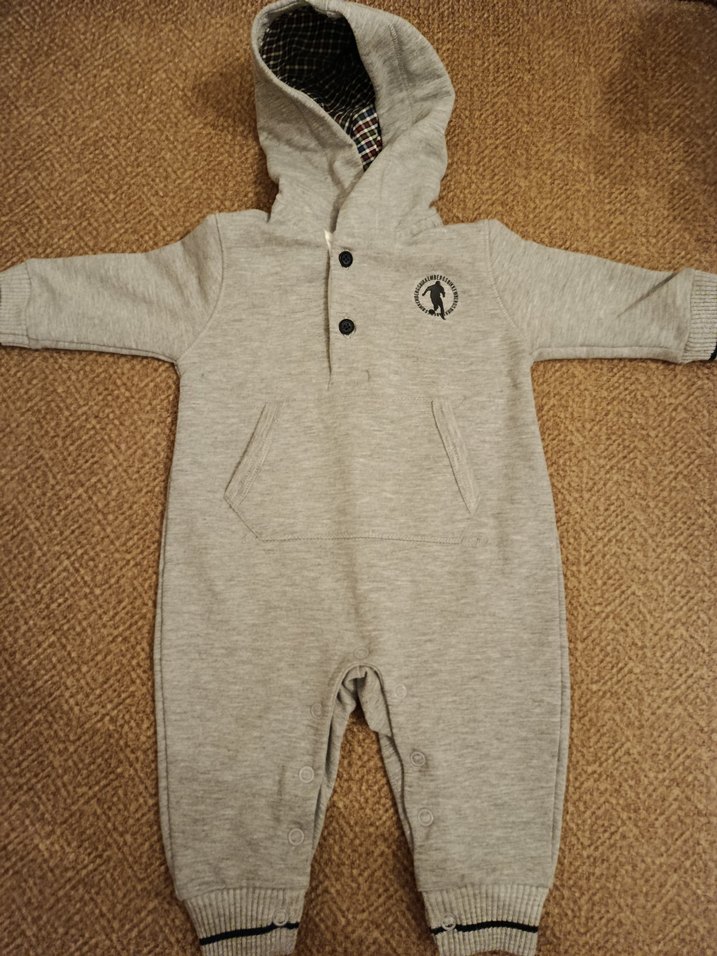 Yumuşak ve sıcak kumaştan, kapüşonlu ve düğmeli gri erkek bebek tulumu, sade sokak stiliyle tasarlanmıştır.