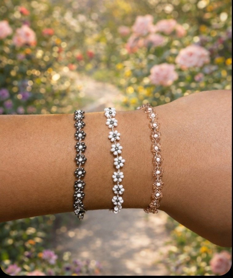 Çiçek desenli, boncuklu ve bohem tarzda günlük kullanıma uygun açık beyaz tonlarında bileklikler. Toplu alımlarda indirime açiktir.