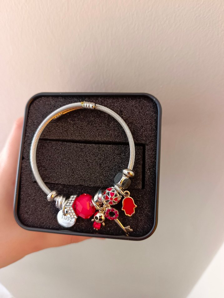 Pandora model bileklik. Renkli boncuklar ve kırmızı detaylı bohem tarzı figürler içeren kadın bilekliği, günlük kullanım için uygundur.