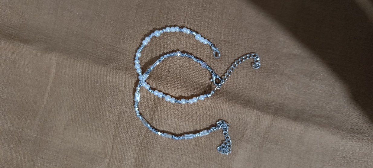 ikisi bı arada . Beyaz boncuklu tasarımlı bileklik. Gümüş renk zincir ve sağlam kapanışa sahiptir. Bohem ve retro tarzlar için uygundur.