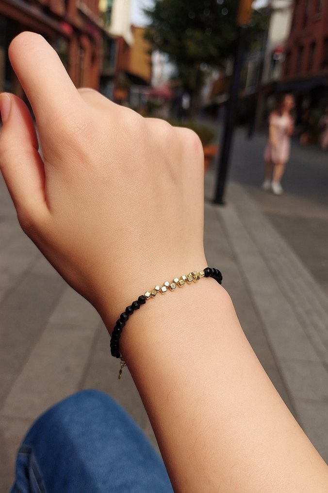 Cam siyah boncuklardan ve nugget metal altın renk kaplamalı ara boncuklardan tasarlanmıştır.Günlük ve iş için uygundur.