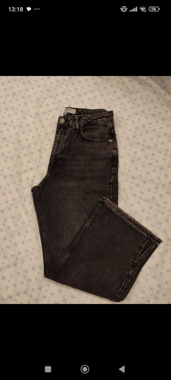 bilekte İspanyol paça kot pantolon jean paçaları yırtmaç detaylıdır. hiç. giyilmedi bedenim uymadı görüldüğü gibidir bir sorunu yoktur. bel basen kısmı oturuyor paçası bol geliyor çok güzel bir pantolon kalıbı harika. etiketi yok sadece mom Jean
