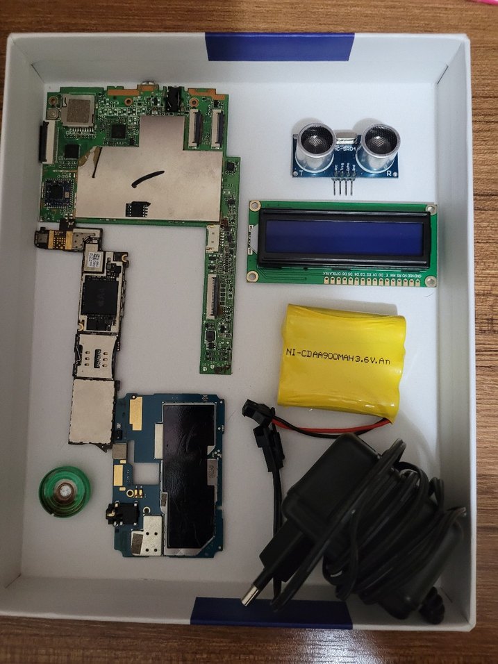 Devre kartları, LCD ekran, sarı batarya, sensör ve şarj cihazı içeren bilgisayar bileşenleri seti. Parçalar kutuda düzenli şekilde yer alıyor. ⚙️