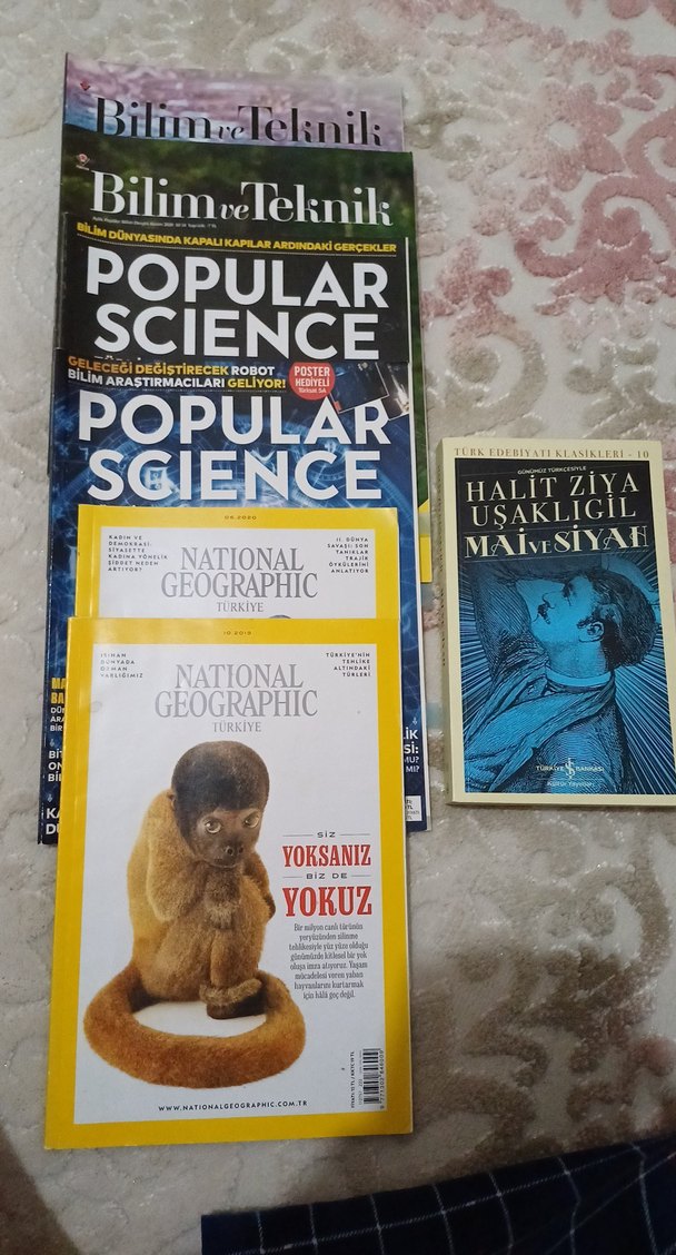 Bilim ve Teknoloji, Popular Science, National Geographic dergileri ile Halit Ziya'nın klasik kitaplarından oluşan set. 6 adet 2020/2021 yıllarına ait bilim dergileri, bir adet Halit Ziya Uşaklıgil'in Mai ve Siyah romanı.