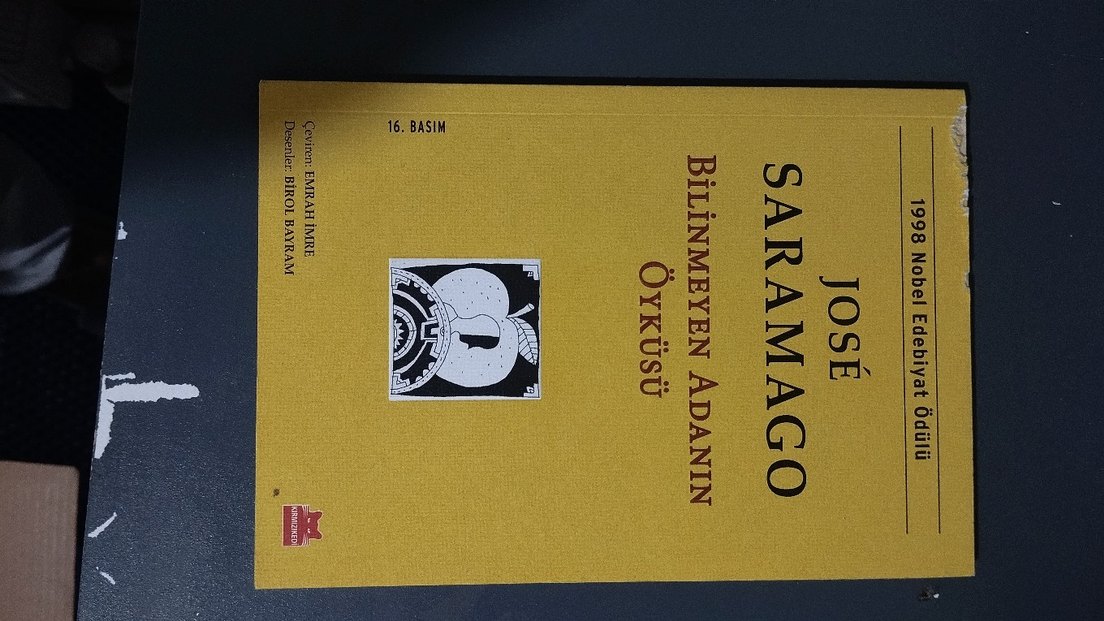 16. basım olan 'Bilinmeyen Adanın Öyküsü' adlı kitabın sarı renkli kapağı ve özgün bir illüstrasyonu vardır.