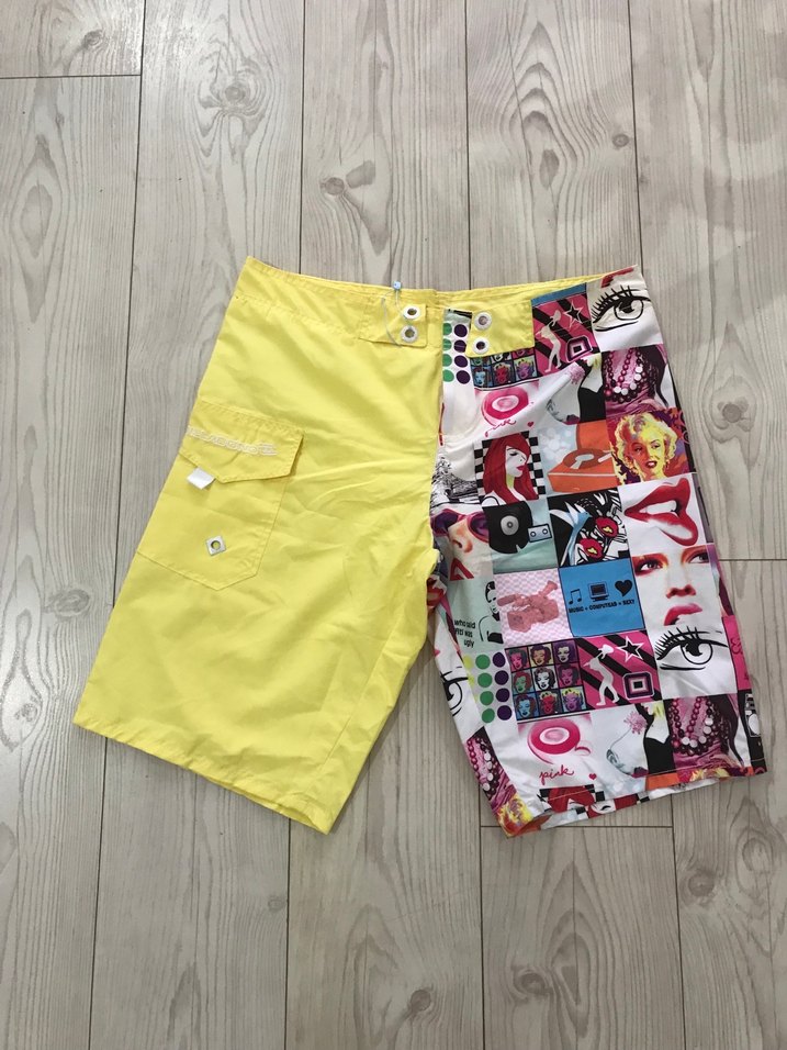 Erkekler için bol kesim, canlı sarı ve pop kültür baskılı mini şort. Düğmeli detaylarıyla plajda dikkat çekici bir tarz sunar. Hiç kullanılmamış