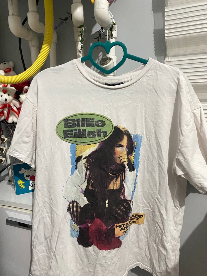 Beyaz pamuklu tişört, kısa kollu ve yuvarlak yaka. Gevşek kesimi ve Billie Eilish baskısı ile grunge punk tarzını yansıtıyor. Günlük kullanıma uygun.