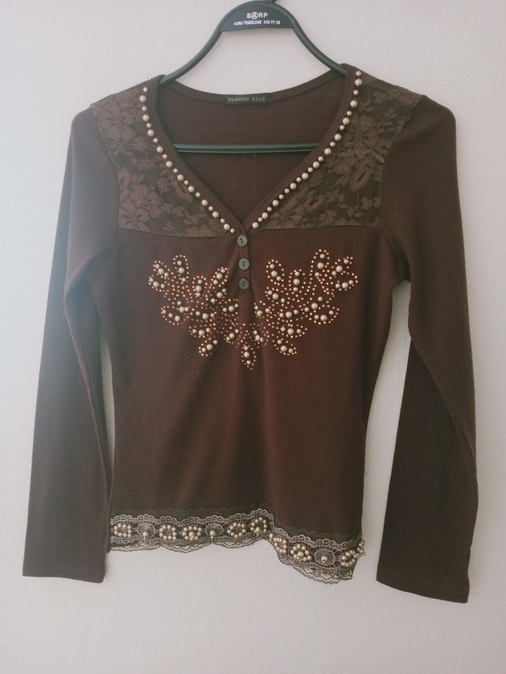 bincuklu Nakışlı Kahverengi Uzun Kollu Bluz