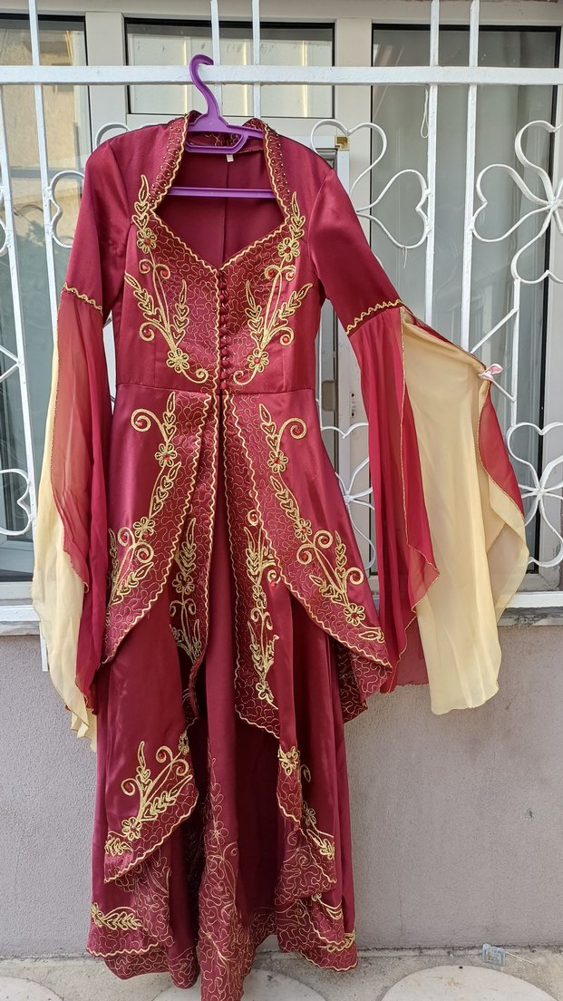 Bordo renkli, nakış işlemeli uzun kadın hint elbisesi, straplez yaka ve drapeli uzun kollara sahiptir. Gevşek kesim ve parlak dokusuyla bohem düğünler için uygundur.