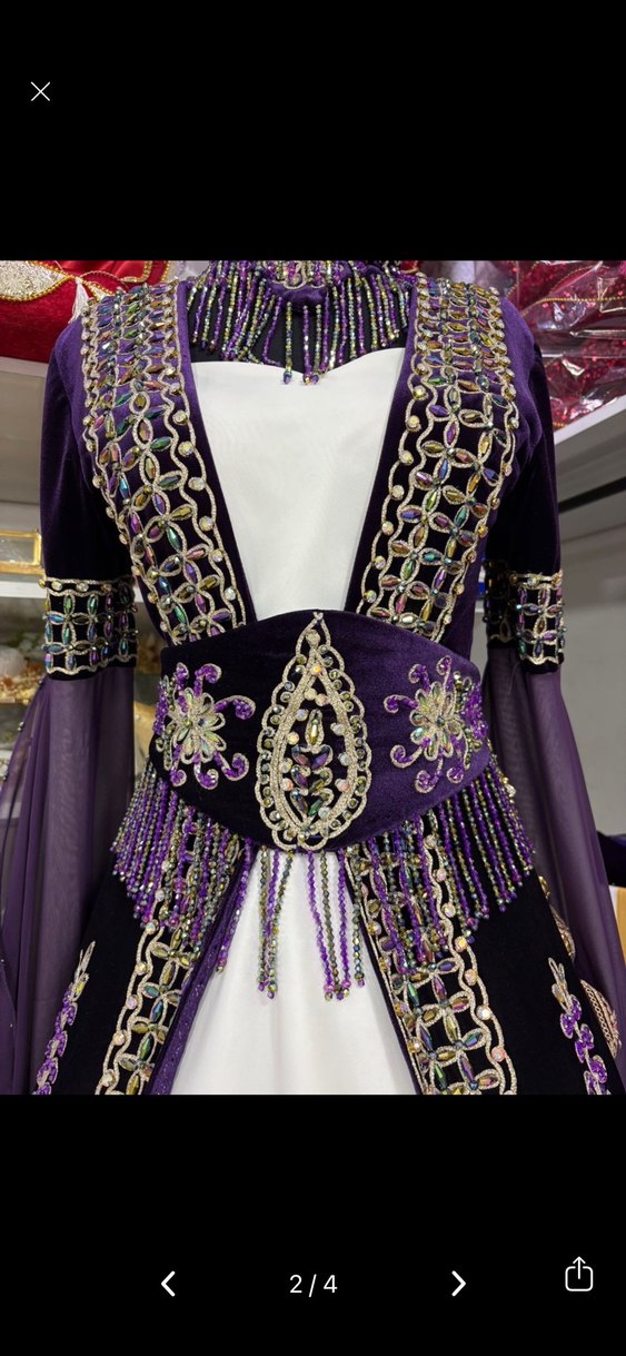 Uzun mor hint elbisesi, straplez ve kolsuz tasarıma, nakışlı desenlere ve drapeli, bol kesime sahiptir. Düğünler için uygundur. Bir kez giyildi. Tam takım. Kuru temizleme yapıldı.