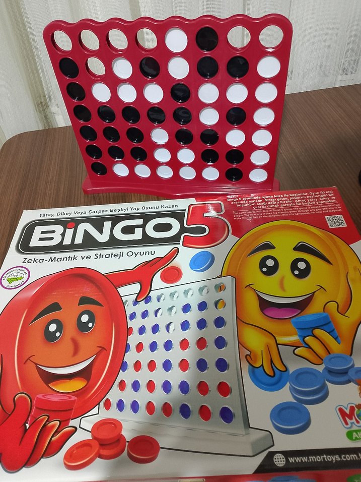 Bingo 5, zeka ve strateji becerilerini geliştiren renkli bir eğitim oyunu. Kırmızı oyun tahtası ve siyah-beyaz pullarla oynanır.