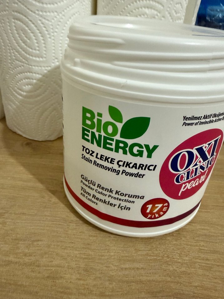 Bio Energy toz leke çıkarıcı, güçlü renk koruması sağlar ve tüm renkler için uygundur. Leke çıkarırken kumaş canlılığını korur. İçini göstermek için etrafındaki kişiyi açtım sadece.