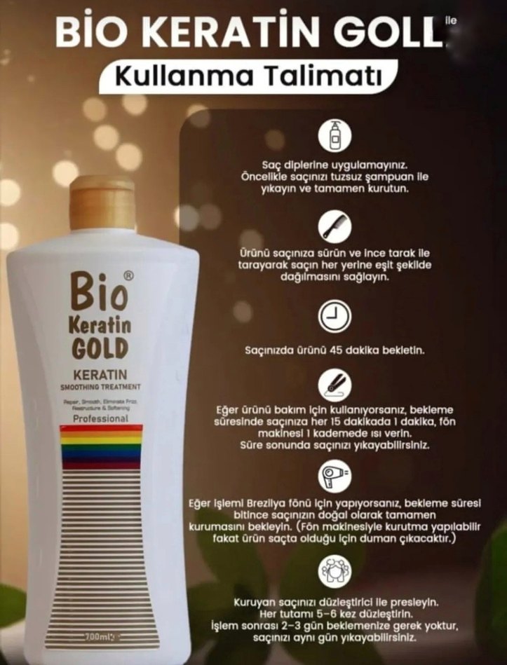 Bio Keratin Gold şampuan saç diplerine uygulanmaz, 45 dakika bekletilir ve yıkanır. Brezilya fönü için doğal kuruması beklenir. İnce tarakla eşit dağıtılır.