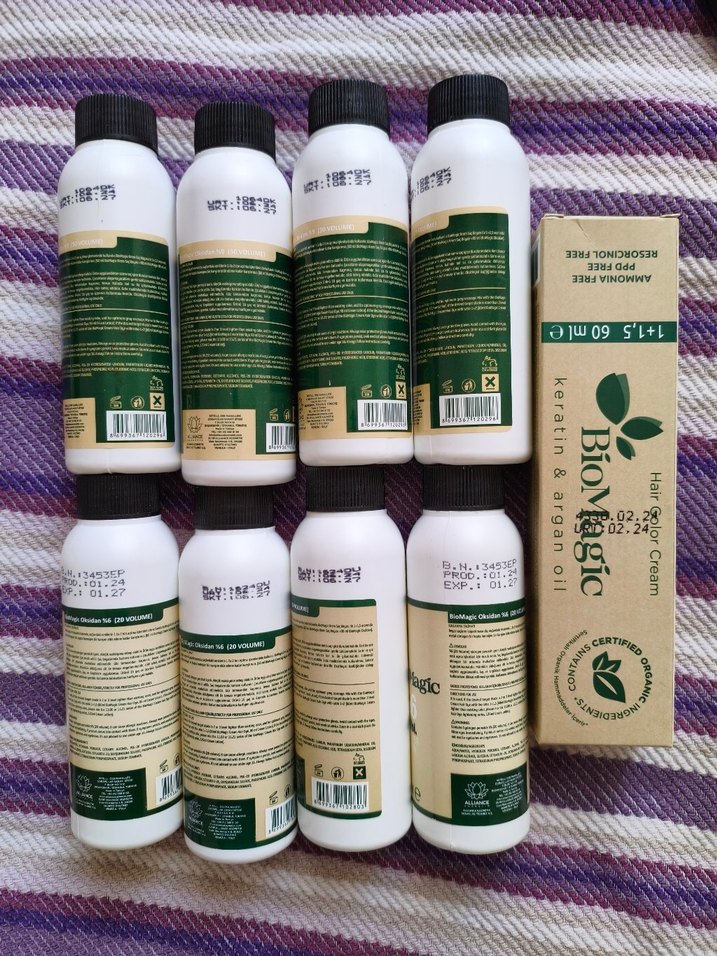Biomagic organik saç boyası gri renk ve 8 tane %6 oksidanlar. saçlarımi artık boyamiyorum. oksidanlari da az kullandığım için fazla kaldı. ürünlerin son kullanma tarihleri belirli. tüm ürünler orijinal netten aldım. tüm ürünler için tek fiyat belirlendi. hepsini alacaklar için indirim yaparım
