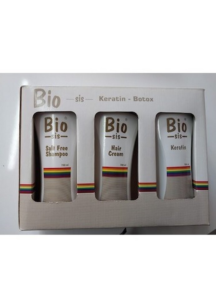 Bio Sis Keratin-Botox set, tuzsuz şampuan, saç kremi ve keratin içeren saç bakım ürünlerinden oluşur.
