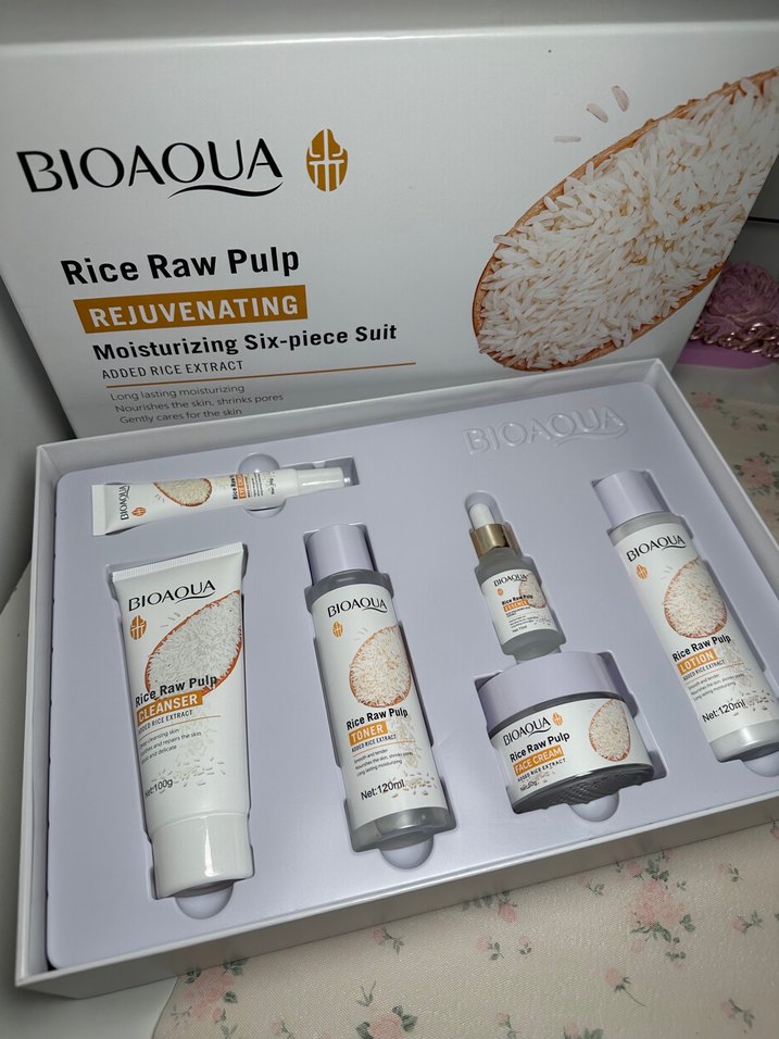 Bioaqua cilt bakım seti, pirinç özü ve eklenmiş pirinç ekstraktı ile cildi nemlendirip yenileyen altı ürün içerir.