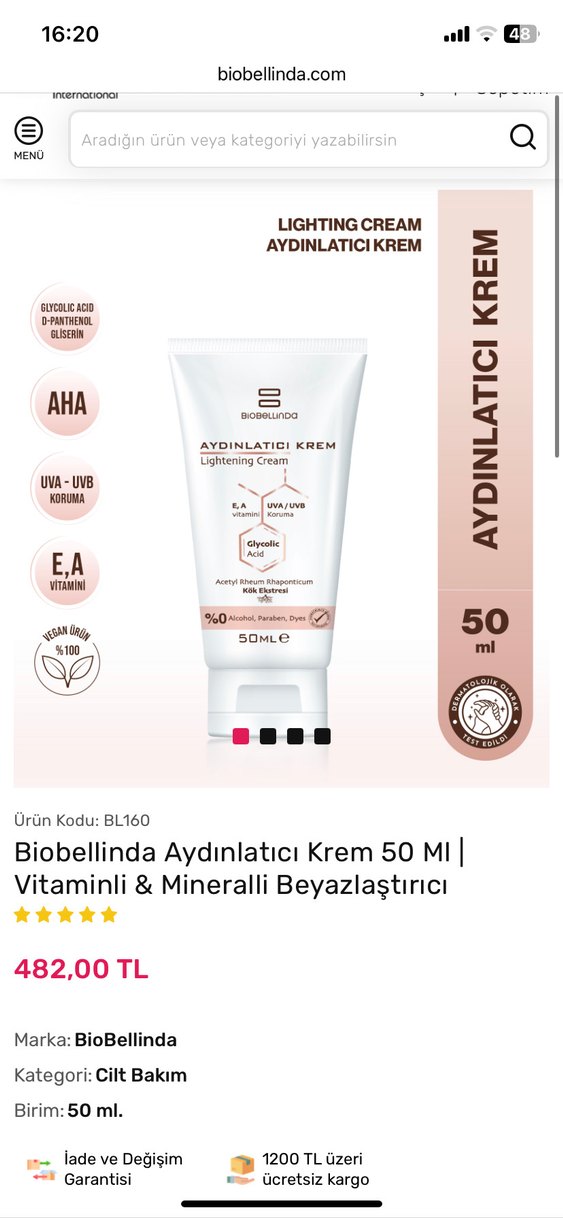 Vitaminli ve mineralli Biobellinda Aydınlatıcı Krem, 50 ml tüpte cildi beyazlatır ve UVA-UVB koruması sağlar. Glikolik asit ve D-pantenol içerir. ✨