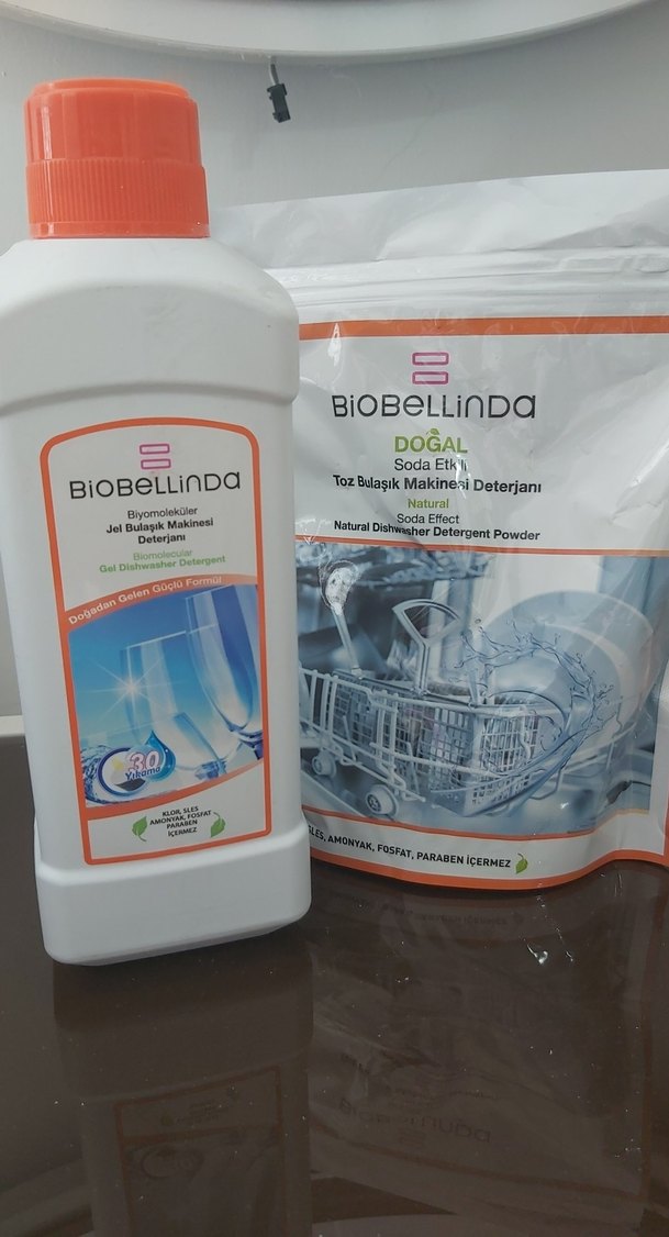 BiOBELLiNDA doğal bulaşık makinesi deterjanları, soda etkili jel ve toz formülleri içerir. Amonyak, fosfat ve paraben içermez.