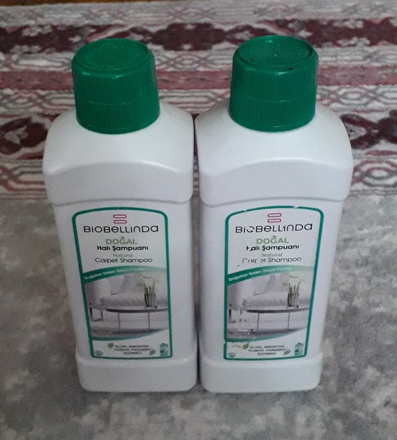 Biobellinda doğal halı şampuanı, halılar ve kilimler için nazik temizleme formülüne sahiptir. Beyaz şişede, yeşil kapaklıdır.